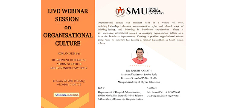 Dr Rajesh Kamath (Faculty, MHA Programme) was the resource person for the webinar on ‘Organisational Culture’ organised by the Department of Hospital Administration, Sikkim Manipal Institute of Medical Sciences through Microsoft Teams on February 22, 2021 (15:00 to 16:30 hours IST).