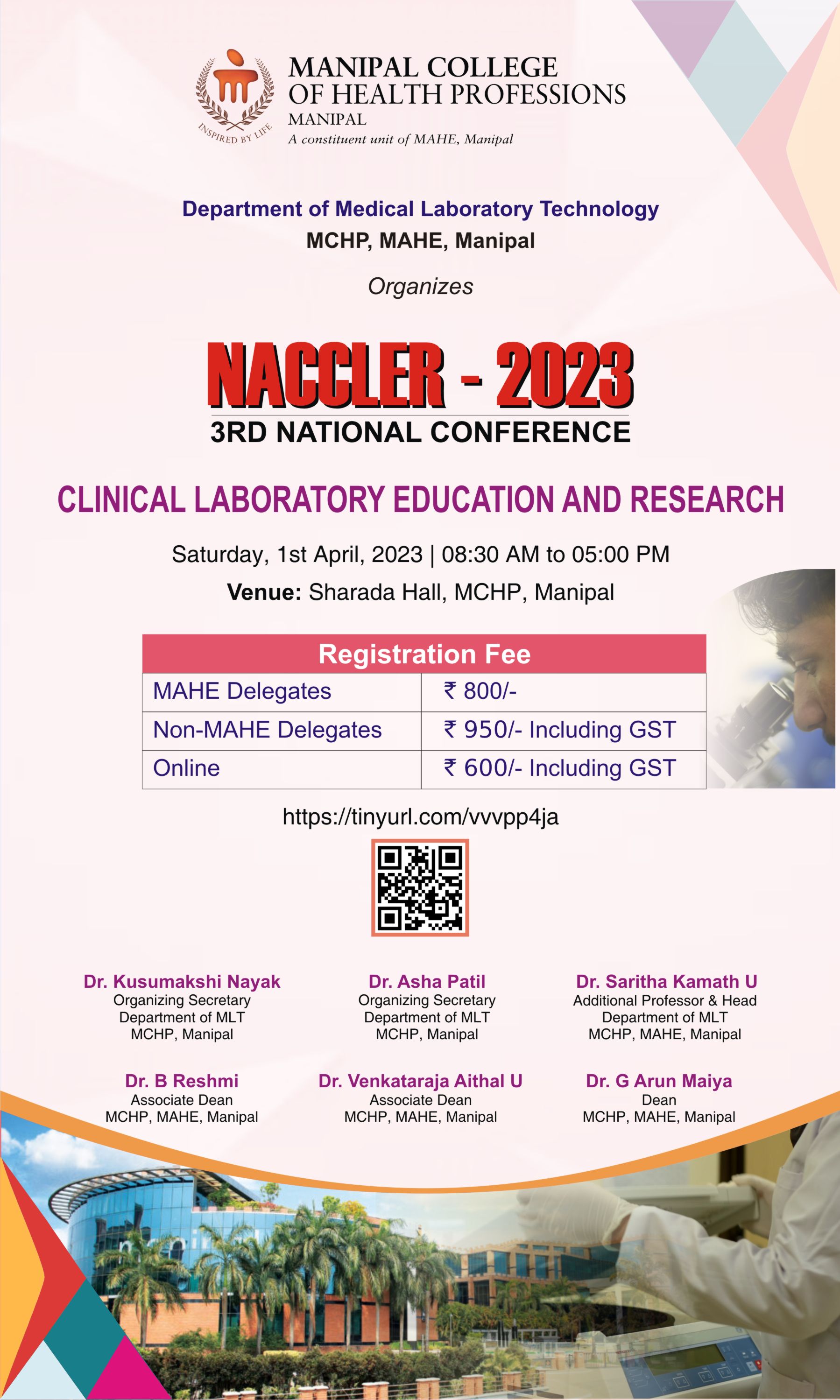 Department of Medical Laboratory Technology, Manipal College of Health Professions, MAHE, MANIPAL organizing 3rd National Conference on Clinical Laboratory Education and Research- “NACCLER- 2023” on Saturday, 1st April 2023