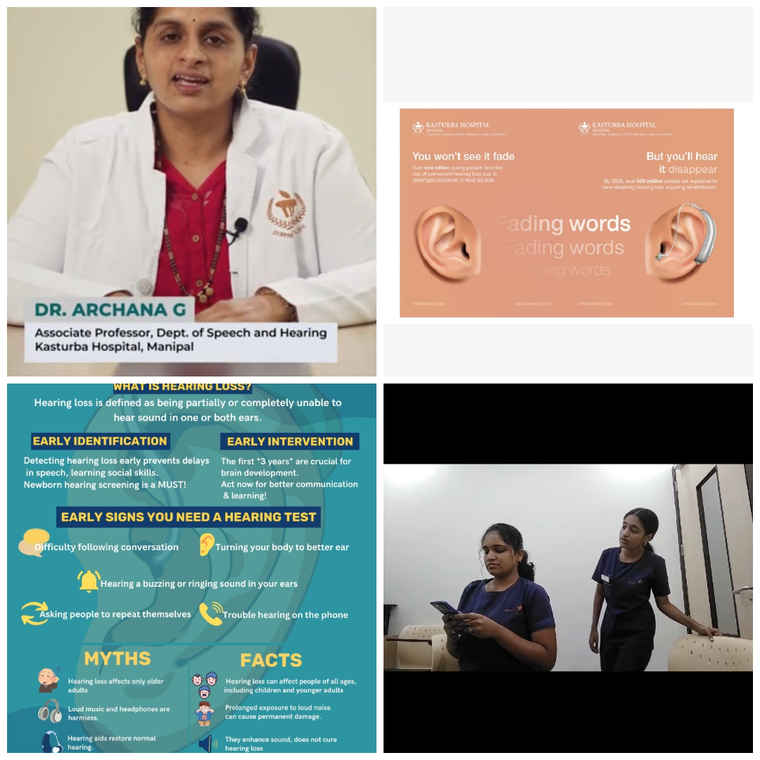 The Department of Speech and Hearing observes World Hearing Day every year in March. This year, the theme is “Changing mindsets: empower yourself to make ear and hearing care a reality for all.” A series of activities have been planned to align with this theme, utilizing mass media in various ways. A newspaper article was submitted addressing the stigma surrounding hearing loss and hearing aids. Dr. Archana delivered a talk on the MAHE Facebook and Instagram pages, focusing on the importance of early identification and intervention for hearing loss. Additionally, students created videos and posters highlighting myths and facts about hearing loss, which were shared across all mass media platforms.
