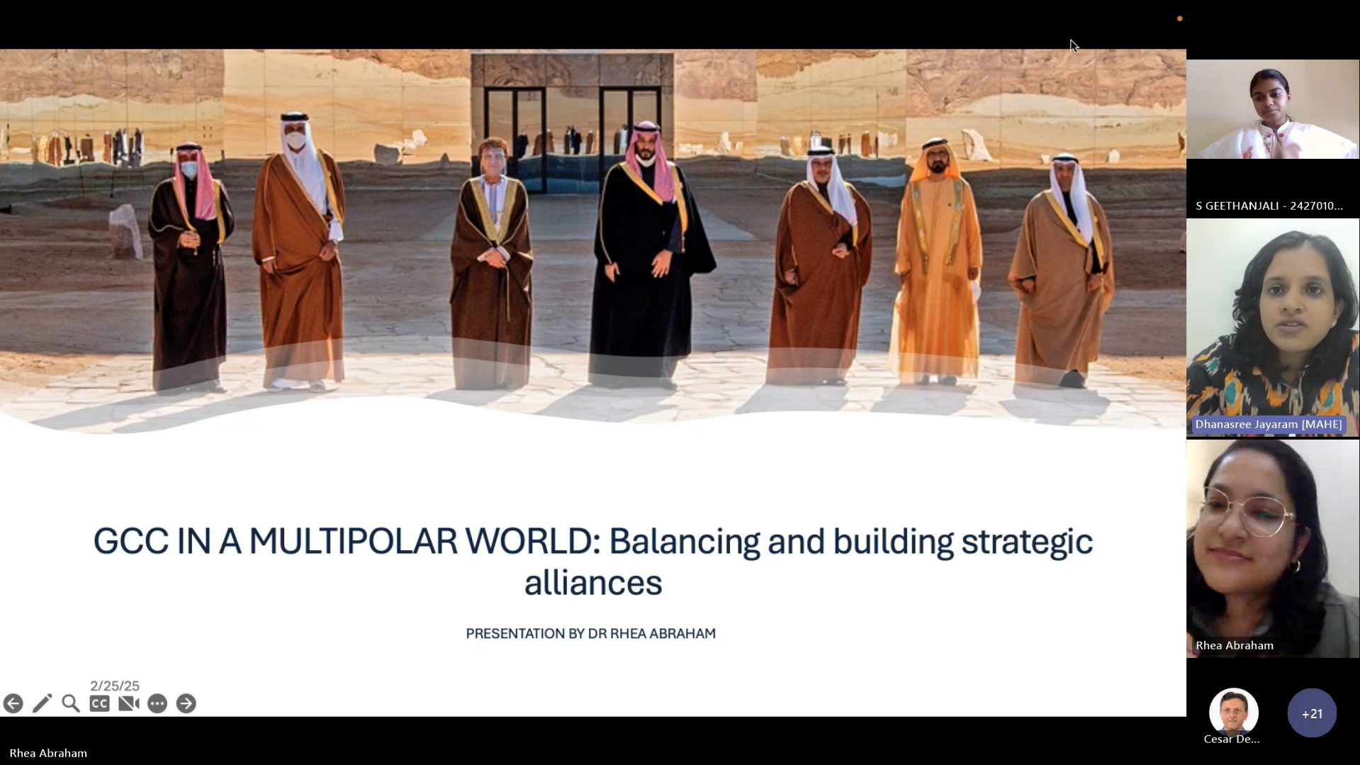 The Department of Geopolitics and International Relations organized a Special Lecture in the virtual mode by Dr. Rhea Abraham, an independent researcher in Bahrain on 25 February 2025. The talk was part of the GEOPOLITICA series as well as the Department's Alumni Connect series. Dr. Rhea is an alumna of the Department (2010-12). She spoke on the theme "GCC in a Multipolar World: Balancing Strategic Alliances".