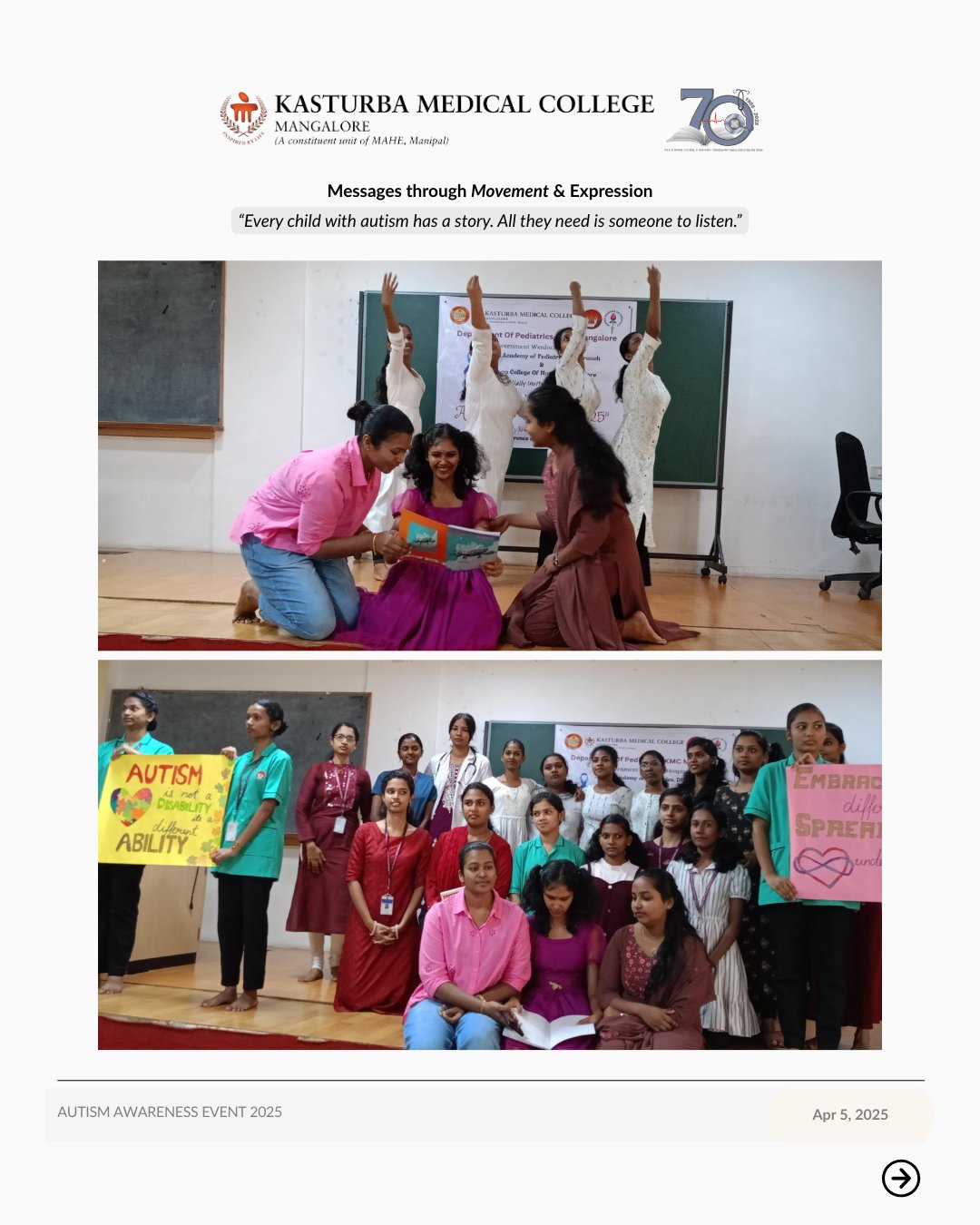 The Department of Pediatrics, KMC Mangalore, in collaboration with Government Wenlock Hospital, Indian Academy of Pediatrics—DK Branch, and Athena College of Nursing, hosted the Autism Awareness Event 2025 on April 5 at the Regional Advanced Pediatric Care Centre.