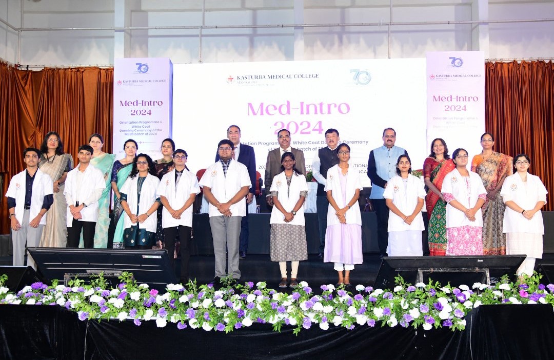 Guest of Honor Dr. Kaushik Murali, an alumnus from the MBBS Batch of 1994, addressed the students and Chief Guest Dr. Dilip G. Naik provided inspiring remarks. The highlight of the event was the White Coat Donning Ceremony, symbolizing the students' official entry into the medical profession.