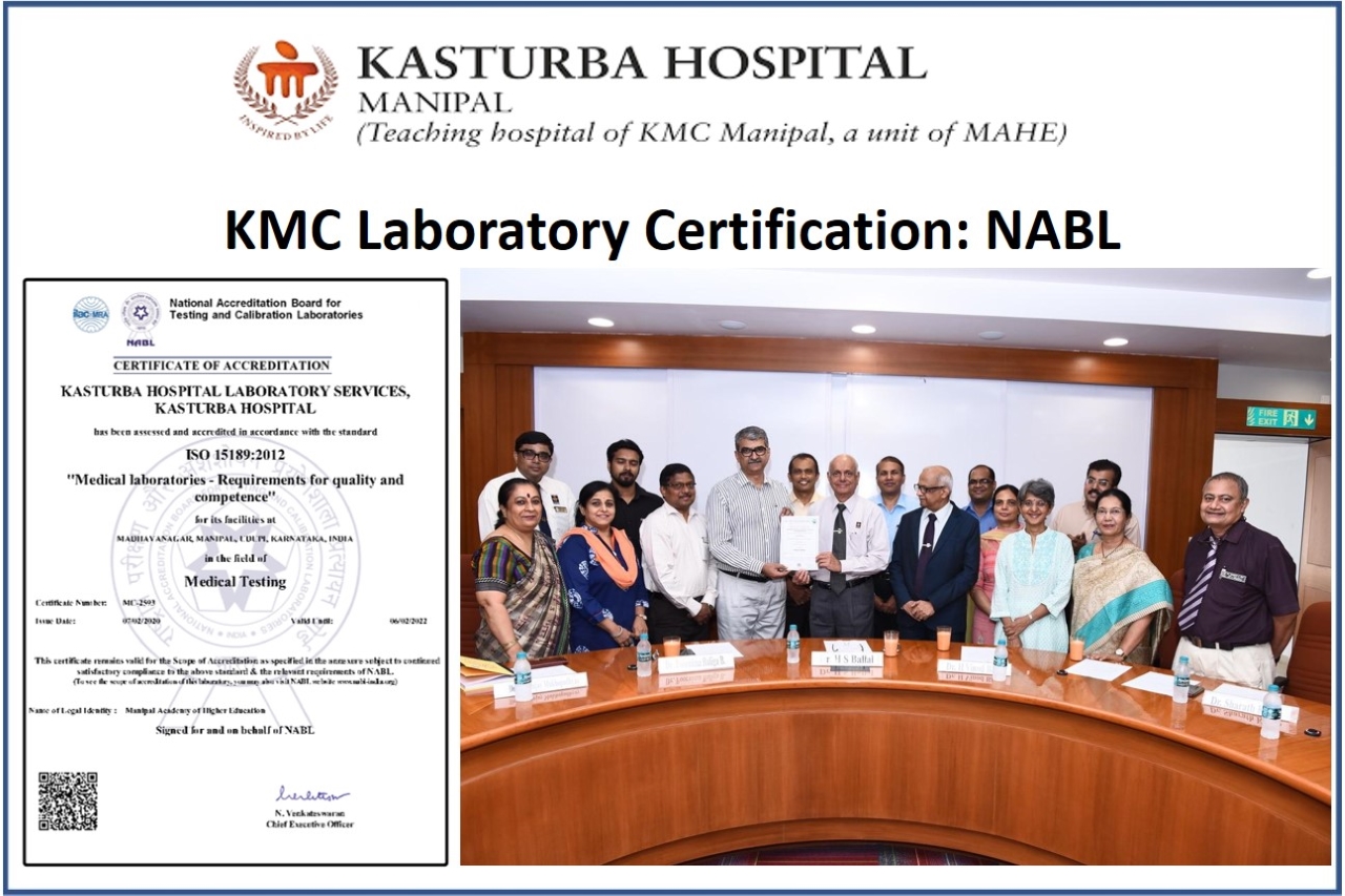 NABL is a Constituent Board of Quality Council of India. NABL has been established with the objective of providing Government, Industry Associations and Industry in general with a scheme of Conformity Assessment Body’s accreditation which involves third-party assessment of the technical competence of testing including medical and calibration laboratories, proficiency testing providers and reference material producer NABL offers accreditation services in a non-discriminatory manner. Kasturba Hospital Laboratory Services (KHLS), a constituent body/ organization of KMC & KH Manipal has been constantly recognized for its excellence in laboratory services.
