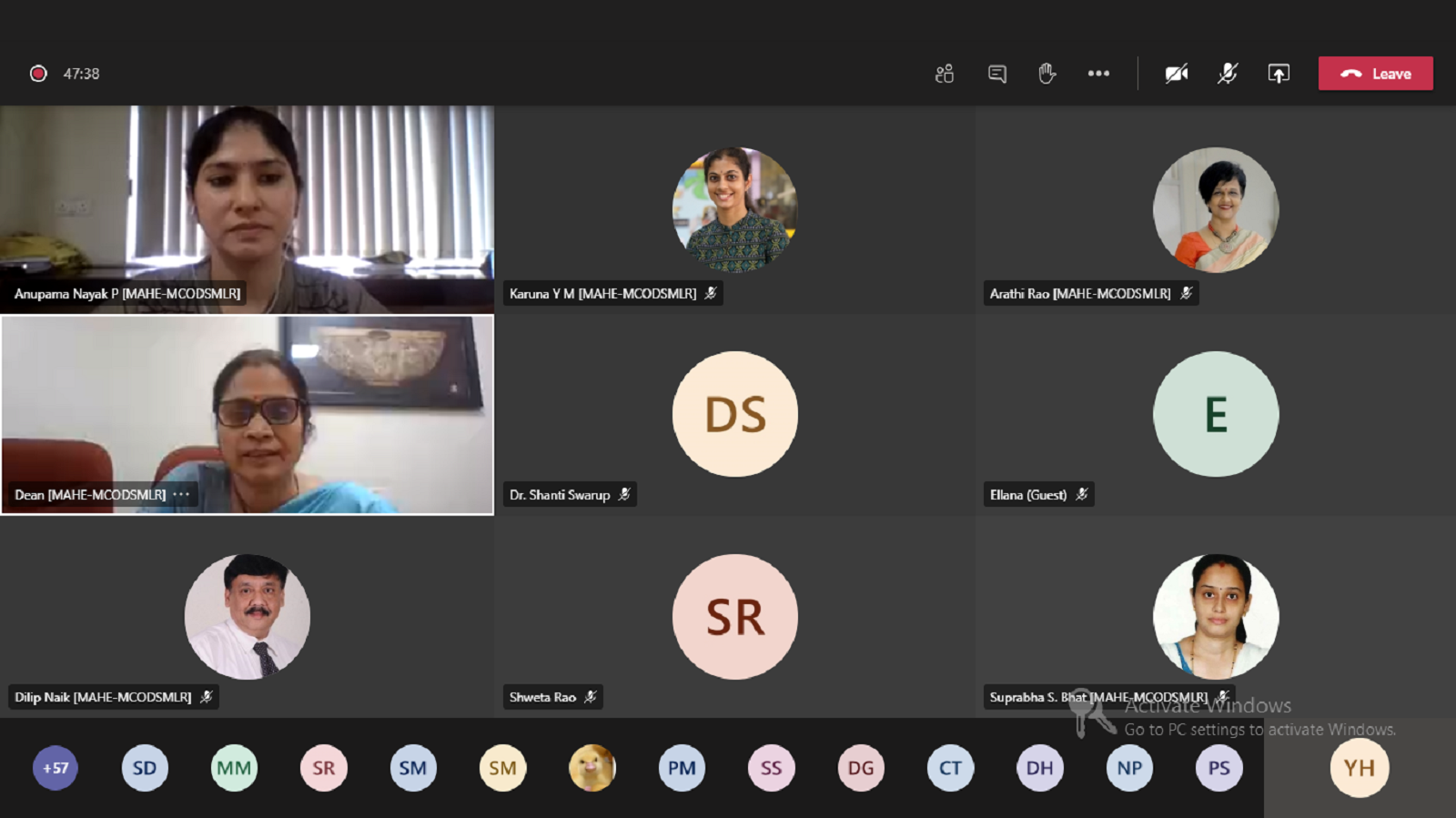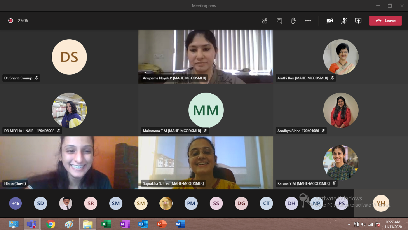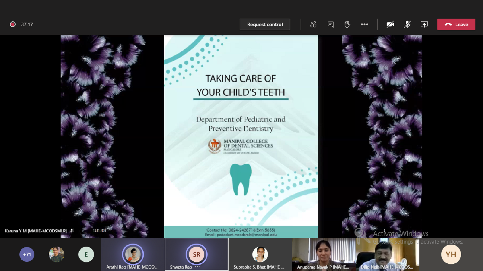 On the occasion of Children’s Day which is also celebrated as Pedodontist’s Day in India, as a part of community engagements  for building stronger communities, a patient education booklet  titled “ Taking Care of Your Child’s Teeth” was released by Dr. Dilip G Naik, Pro Vice Chancellor, MAHE (Mangalore Campus). Dr. Ashita Uppoor, Dean, MCODS, Mangalore and Dr. Premalatha Rai, Associate Dean, graced the occasion. A Panel Discussion on career options after post-graduation in Pediatric Dentistry titled, “Post-Graduation in Pediatric Dentistry: When, Why, How”, was moderated by Dr. Ashwin Rao, Associate Professor, Department of Pediatric and Preventive Dentistry. Dr. Shanti Swarup, Dr. Vidya Chandran, and Dr. Shweta Rao, Post graduate Alumni of the Department of Pediatric and Preventive Dentistry, enlightened the under graduate students  regarding scope of Pediatric Dentistry. The program was well appreciated and attended by 108 participants.
