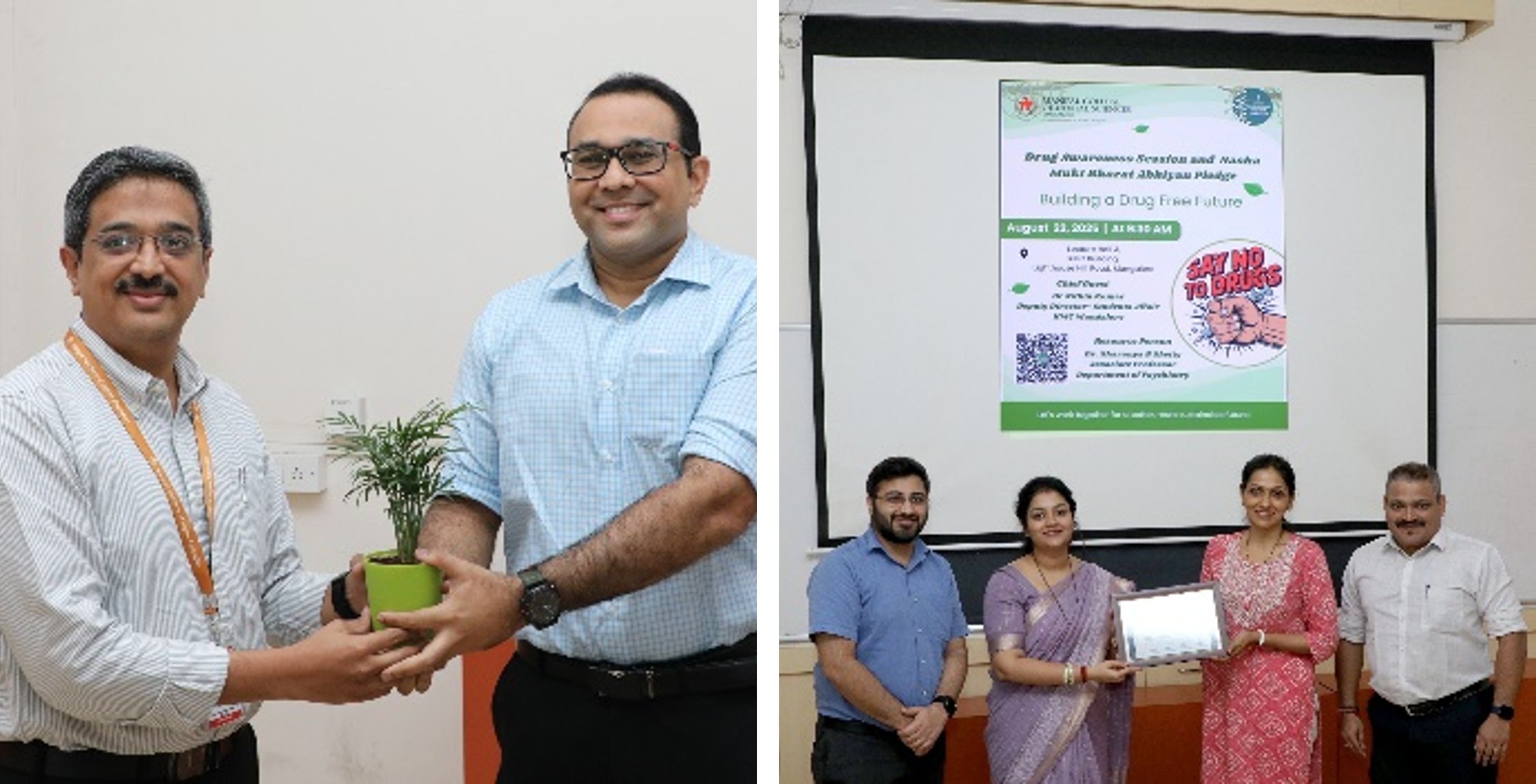 The chief guest, Dr. Nithin Kumar, Deputy Director, Student Affairs, KMC Mangalore, explained hostel rules, regulations, and protocols related to drug prevention. The resource person, Dr. Sharanya Shetty, shared her insights on various substances, their effects, and available support systems both on- and off-campus.
