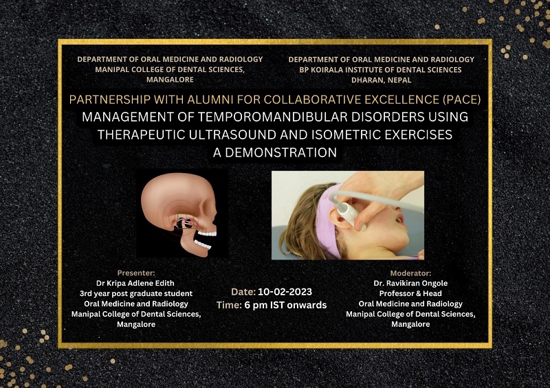 The Department of Oral Medicine and Radiology held a program under the PACE initiative on 10.02.2023. A presentation on “Management of Temporomandibular Disorders using Therapeutic Ultrasound and Isometric exercises” was done by Dr. Kripa Adlene Edith, post graduate student, and was moderated by Dr. Ravikiran Ongole. The program was attended by faculty and students of MCODS, Mangalore and B.P Koirala Institute of Dental Sciences. It was an interactive session with all the participants sharing their experiences of temporomandibular disorder diagnosis and management protocols.