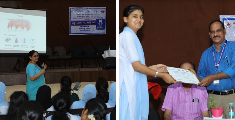 On the occasion of World Oral Health Day, the Department of Public Health Dentistry in collaboration with the "Health and Family Welfare, National Oral Health Program, Dakshina Kannada District & Department of Periodontology organized special events at Besant Women’s college, Mangalore. A role play and oral health awareness programme was organized at Besant Women’s college by MCODS, Mangalore. The roleplay was done by final year BDS students of MCODS Mangalore and focused on the importance of oral health. A health talk was given by Dr. Deepa Kamath from Department of Periodontics to create awareness among the students about women’s oral health. A “picturequest” competition was held for the students of Besant college and the winners were awarded during the valedictory ceremony of the event.  Oral screening camp was conducted for the students of Besant women’s college. The dignitaries present were Dr. Thimmaiah HR- District Health Officer, Dakshina Kannada, Prof. Rajshekhar Hebbar, Administrative Officer of Besant College, Dr. Laveena, District NOHP officer, Dean of MCODS Mangalore Dr. Ashita Uppoor, Associate Dean of MCODS Mangalore Dr. Junaid Ahmed and the Head of the Department of Public Health Dentistry Dr. Ramya Shenoy.