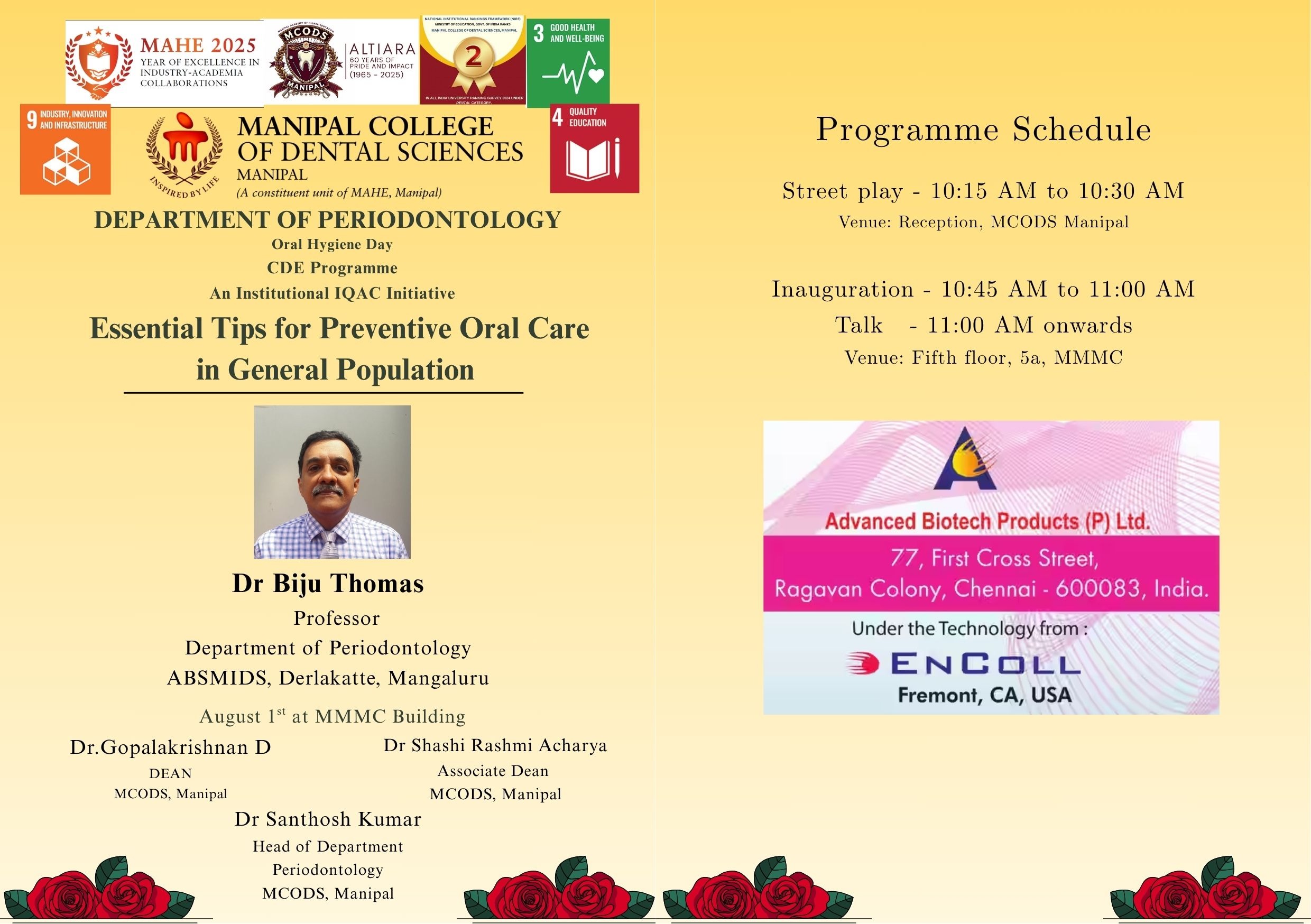 Team Malang energized the campus with a thought-provoking street play promoting oral hygiene awareness. An interactive session titled "Essential Tips for Preventive Oral Care in General Practice" was delivered by Dr. Biju Thomas, Professor at ABSMIDS, Mangalore, enriching the minds of undergraduate an d postgraduate students. A Dental awareness program in various departments of KMC, Manipal OPD, was conducted by Dr. Namratha, Dr. Shashikiran, and Dr. Srilaxmi to educate the general public on oral health and its links to systemic health and oral hygiene practice was demonstrated on 28th, 29th & 30th July 2025. Free dental screening and scaling services were offered to all patients visiting the department on 31st July 2025.