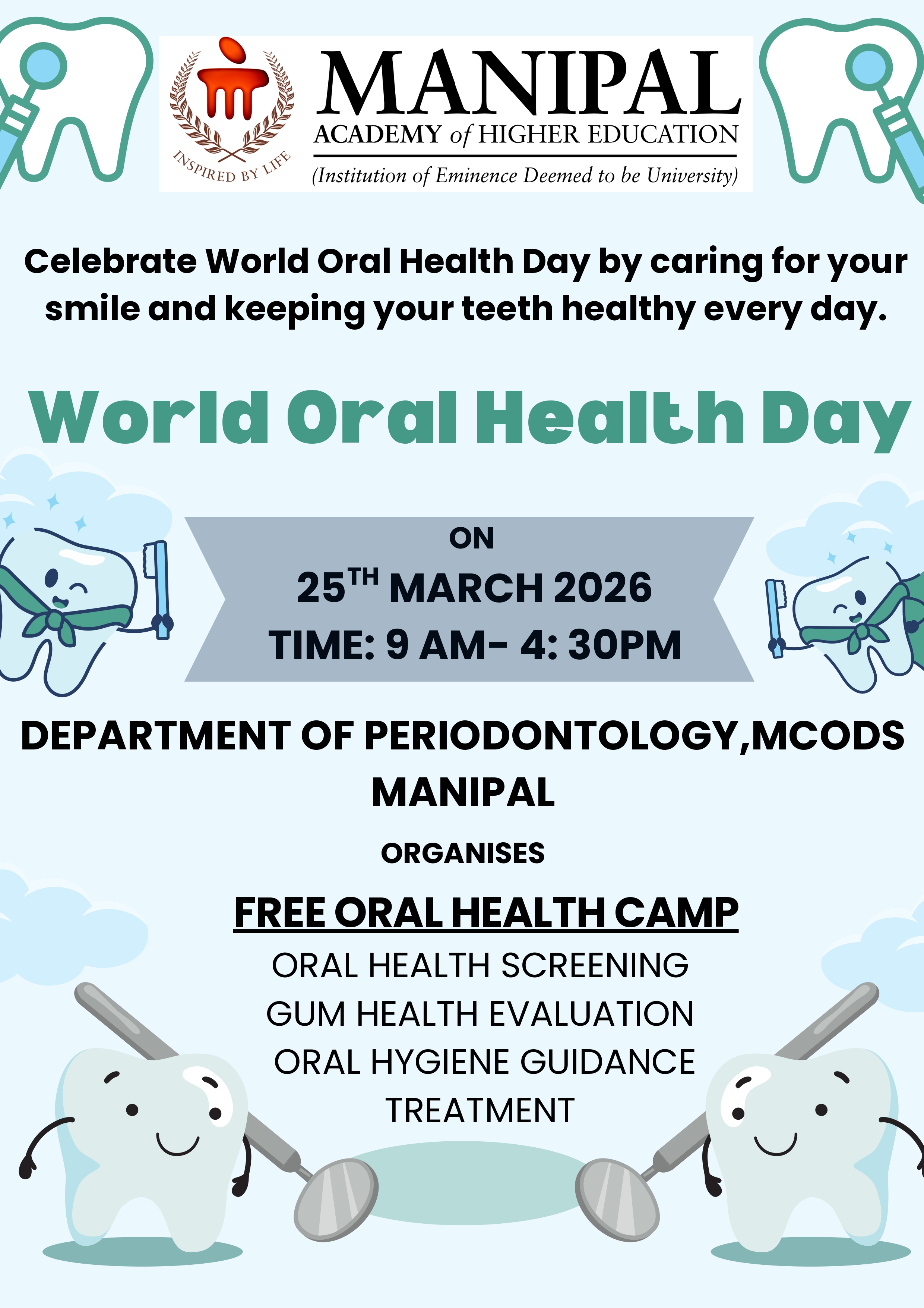 The Department of Periodontology, MCODS, Manipal, organized an oral health screening and treatment camp in observance of World Oral Health Day at Manipal Payment and Identity Solutions, Manipal, on March 25, 2026. The program was conducted under the leadership of Dr. Santhosh Kumar, Professor and Head of the Department, and Dr. Gopalakrishnan D, Dean, MCODS, Manipal. The initiative aimed to raise awareness about the importance of oral health and its impact on overall systemic well-being. The departmental team performed comprehensive clinical examinations, educated participants about their dental conditions and treatment needs, and emphasized the importance of maintaining good oral hygiene practices. A total of 158 individuals were screened, of whom 33 received appropriate treatment. This program orients with SDG goals 3, 4and 17.
