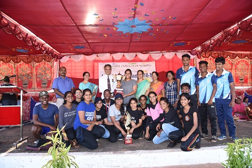 The individual championship (M) was bagged by Mr. Alson, 2nd year BSc Nursing and Best outgoing sports man was bagged by Mr. Shailesh Kumar, 4th year BSc Nursing student. Ms. Swathi Naik, 2nd year BSc Nursing bagged the individual championship for women. The Best Outgoing Sports Woman was bagged by Ms. Anushree Naik, 4th Year BSc Nursing. The group ‘KNIGHTS’ won the overall championship. The programme came to an end with vote of thanks by Dr. Ramesh C, Sports Co advisor.