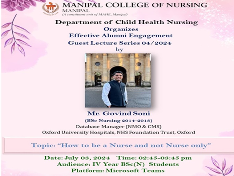 A guest lecture on “How to be a Nurse and not Nurse only” was organised by the Department of Child Health Nursing, MCON Manipal, on July 3, 2024, at 2.45 pm through Microsoft Teams.