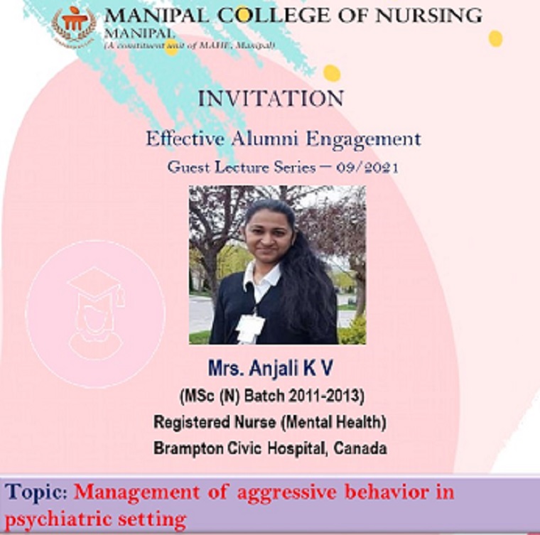 An alumni guest lecture was arranged by the Department of Psychiatric (Mental Health) Nursing, Manipal College of Nursing (MCON), MAHE, Manipal for the UG and PG nursing students on 17th December 2021 through online mode. The resource person was Mrs. Anjali, Registered Nurse (Mental Health) at Brampton Civic Hospital, Canada. She is an alumnus of MCON, MAHE, Manipal: MSc (N) 2011-2013 batch. Mrs. Anjali deliberated a session on “Management of aggressive behavior in a psychiatric setting". She discussed the methods that are utilized in Canadian psychiatric settings to recognize the signs of aggression in a client and emphasized the interventions carried out based on the cultural, ethical, and legal basis. A total of 113 participants (students from III year BSc, II year PBBSc and II year MSc Nursing) attended the session.