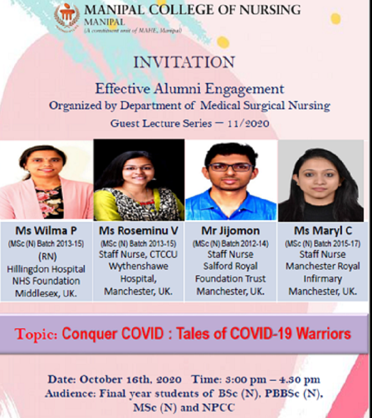 Department of Medical-Surgical Nursing, Manipal College of Nursing Manipal has organized alumni guest lecture on the topic Conquer COVID: Tales of COVID-19 Warriors on 16 October 2020 between 3 pm to 4.30 pm. Mr. Jijomon (alumnus of MCON, MSc (N) 2012-2014 batch) Ms Maryl Cutinho (alumnus of MCON MSc (N) 2015-2017 batch), Ms. Roseminu Varghese (alumnus of MCON MSc (N) 2013-2015 batch), and Ms. Wilma Padmanabhan (alumnus of MCON MSc (N) 2013-2015 batch) were the resource persons for the session. They spoke about the COVID scenario in the United Kingdom, especially at their workplace. They shared their experience of managing COVID 19 patients, how they themselves suffered from the disease, the dilemma which they have faced, the fear and the uncertainties, the ways they adapted to come out of the situation etc. They highlighted the protocols which are being used during the COVID 19 epidemic across NHS foundations in the UK as well as their facility’s policies. The session was deliberated using Microsoft teams platform. A total of 124 participants including faculty members and students from 4th year BSc Nursing, 2nd-year PBBSc Nursing, 2nd year MSc Nursing and 2nd year Nurse Practitioner in Critical Care Residency programme attended the session. This program was coordinated by Mrs Janet Prameela D’Souza, Assistant Professor, Manipal College of Nursing Manipal, MAHE, Manipal.