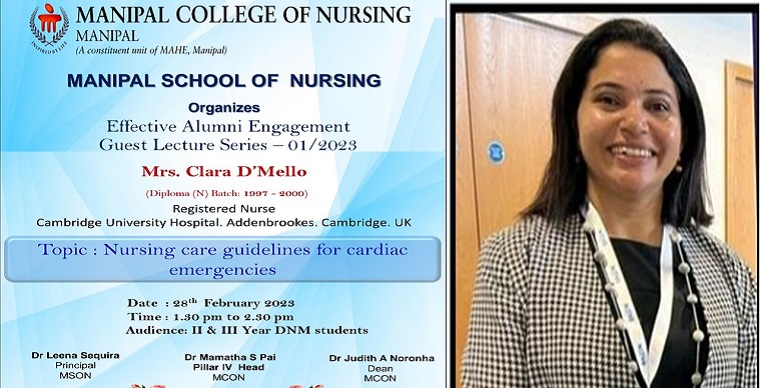 Manipal School of Nursing, MCON, MAHE, Manipal had organized an online guest lecture on the topic “Nursing care guidelines in cardiac emergencies” by Mrs.Clara D’mello, Registered Nurse, Cambridge University Hospital, Addenbrookes, Cambridge, UK on 28th of February 2023 at1.30pm.