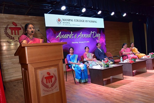 Nurses form the largest cadre of professionals in the health care setup. Nursing profession needs a complete image change to achieve the Sustainable Developmental Goals (SDG) and there is an urgent need for transformation in both government and private sector said Dr. Rathi Balachandran, Assistant Director General of Nursing, Ministry of Health and Family Welfare, Govt. of India during the 24th Awards and Annual day function of Manipal College of Nursing Manipal MAHE.