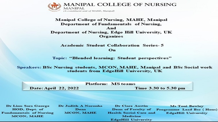 Department of Fundamentals of Nursing, Manipal College of Nursing (MCON), MAHE, Manipal and Department of Nursing, Edge Hill University, UK organized Academic Student Collaboration Series- 5 on “Blended learning: Student perspectives” on 22nd April 2022 between 3.30 pm & 5.30 pm through MS Teams Virtual Platform.