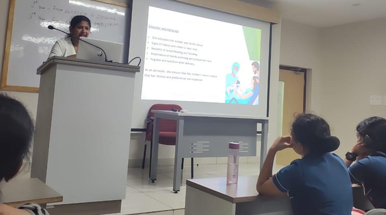 Manipal School of Nursing, MCON, MAHE Manipal hosted a guest lecture on "Role of nurse in the Labour Room” on 13th October 2025, between 3.00 pm – 4.00 pm. The target audience is III year GNM students. Ms. Vidhya Manjunath Acharya (DNM Batch 2004-2007), Staff Nurse, University Hospital Sharjah, UAE, was the resource person. She emphasized the role of a nurse in each stage of labour and the protocol followed during medication administration and management.