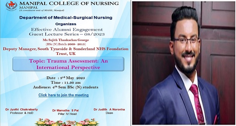 Road-traffic collisions are increasing at an annual rate of 3%. A vehicular accident is reported every 2 minutes, and a death every 8 minutes on Indian roads could hinder attaining SDG 3. To prepare the nurses to deal with trauma victims, the Department of Medical-Surgical Nursing, Manipal College of Nursing, Manipal, organized an effective alumni engagement Guest Lecture on “Trauma assessment: An International Perspective” on May 03, 2023, between 11.30 am & 12.30 pm to 4th Semester BSc Nursing students through Microsoft Teams Platform. Mr. Sujith Thankachan George (BSc (N) Batch: 2010- 2014) Deputy Manager, South Tyneside & Sunderland NHS Foundation Trust, UK spoke on the topic. He emphasized various guidelines to be followed for major trauma assessments in the UK. He also discussed various career advancement opportunities available for nurses in the field of trauma nursing. The speaker also detailed the trauma code activation, the trauma nursing process, and the job responsibilities of a trauma lead nurse. A total of 115 participants, including 4th Semester B.Sc (N), and faculty members of the college, participated in the session.