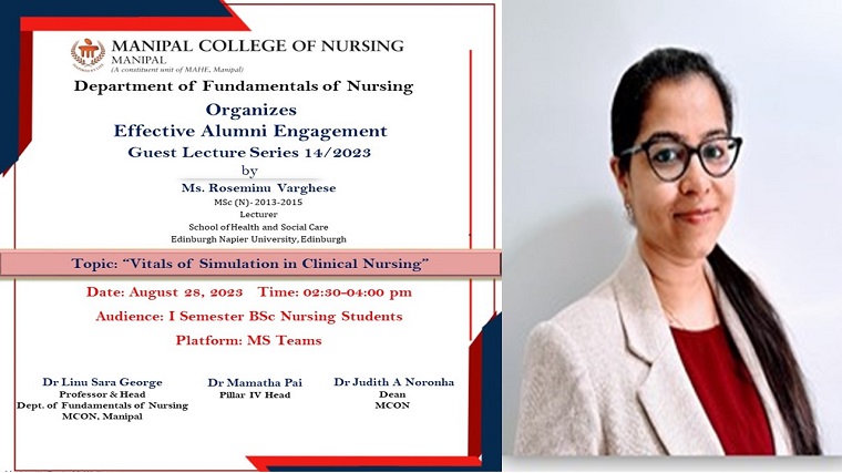 The Department of Fundamentals of Nursing conducted effective alumni engagement, guest lecture series 14/2023 at 2.30 PM on August 28, 2023, for First-Semester BSc nursing students. Ms. Roseminu Varghese, Lecturer in the School of Health and Social Care at Edinburgh Napier University (ENU) UK, and alumnus of MCON from the MSc nursing batch 2013- 2015 deliberated a session on “Vitals of Simulation in Clinical Nursing” through the MS Teams platform.