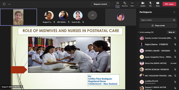 A webinar on "Role of Midwives in Postnatal Care" was organized on 6th May 2022 between 09.00 am to 10.00 am on Microsoft Teams Platform. Ms. Smitha Priya Rodrigues, Registered Nurse, BUPA Care services, Christchurch,New Zealand, focused on role of midwives in postnatal care that included postnatal assessment, newborn assessment, postnatal care, newborn care and breast feeding. Mrs. MST Mousomy Perveen, II MSc nursing student, Dept. of OBG (N) MCON, MAHE Manipal, gave welcome address and moderated the webinar. Mrs. Ranjani P, Assistant Professor Senior Scale, Dept. of OBG (N) MCON, MAHE Manipal, introduced the speaker. Ms. Dafinia Lamare, II MSc nursing student, Dept. of OBG (N) MCON, MAHE Manipal, rendered the vote of thanks. Around 70 participants, including students benefited through this program.