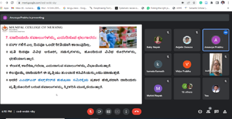 The department of Child Health Nursing, in association with RSB Mahila Vedike Manipal organized the sessions on ‘Nursing as profession and its scope’ on 10th May 2022 between 5.30pm to 6.30pm through google meet with the view create an awareness about the nursing profession among younger generation & community. Mrs. Anusuya V Prabhu, Assistant Professor, MCON Manipal highlighted different level of available nursing courses, career opportunities and importance of nurses in health care field. The admission process and scholarship facilities for nursing students were discussed by Mrs. Janet Alva, Assistant Professor, MCON Manipal. A total of 29 women with their families and nine faculty members participated in this program. The program was co-ordinated by Dr.Anjalin Dsouza, Assistant Professor, MCON Manipal.