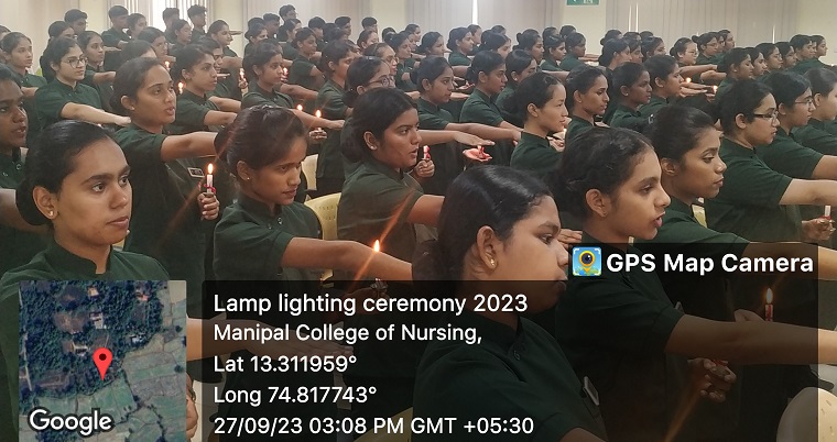 The lamp lighting ceremony for the 34th batch of BSc Nursing students of Manipal College of Nursing, MAHE, Manipal, was held on 27th September 2023 at Dr TMA Pai Hall, II Floor, KMC, Manipal. The program began by invoking God’s blessings with a prayer song. The esteemed guests present were Dr. Toni Bewley, Program Lead & Senior Learning and Teaching Fellow, Edge Hill University, UK, and an Adjunct faculty MCON, MAHE, Manipal, and Dr. P Giridhar Kini, Registrar, Manipal Academy of Higher Education. Mrs. Charlet Vaz, Class Coordinator, delivered the welcome address and introduced the chief guest, followed by ceremonial lighting and a floral tribute to the portrait of Florence Nightingale by the dignitaries on the dais. The chief guest, Dr. Toni Bewley, congratulated the students for choosing the nursing profession and emphasized the caring aspects of nursing and the journey of Florence Nightingale to the budding nurses. She said as we go through the journey as nurses, we face many challenges, and it's our responsibility to keep the patients first. The students were told to make a positive difference in the patients' lives. Dr. P. Giridhar Kini, Registrar of MAHE in his address highlighted the importance of discipline, attendance, internal assessment of marks, application of learning, setting priorities, maturity, social media influence, time management, being healthy, and enjoying the challenges they face in this academic journey. The lamp lighting ceremony, as a symbol of initiation to the nursing profession was given to a total of 139 students of first semester BSc Nursing students. They received the light from the Chief Guest Dr. Toni Bewley, Dr. Judith A. Noronha, Dean, Dr. Linu Sara George, Professor & HoD, Fundamentals of Nursing and Dr. Jyothi Chakrabarty, Professor & HoD, Medical Surgical Nursing. This was followed by the oath-taking ceremony where the student nurses took the oath to discharge their duties with complete honesty, integrity, and no discrimination. Ms. Mitchell Shilpa Lewis, Lecturer, Department of Fundamentals of Nursing compered the event.