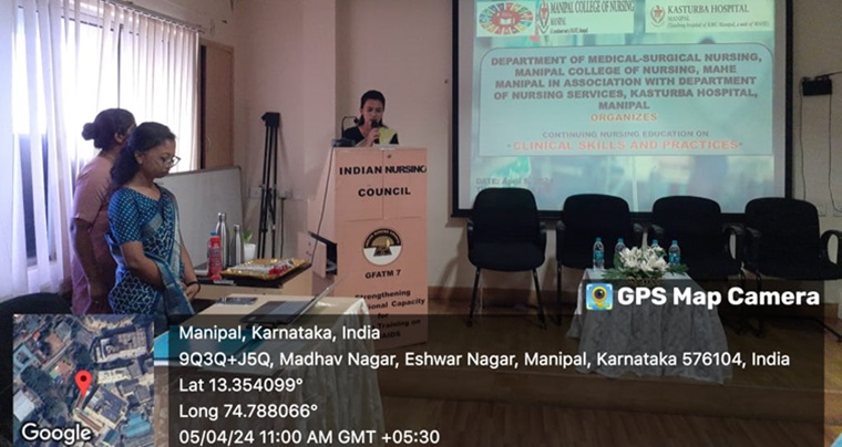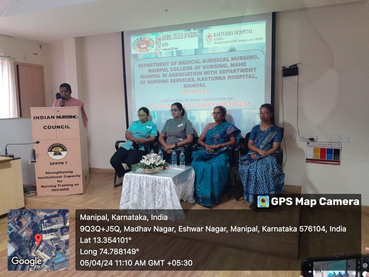 A continuing nursing education programme was organized on the topic “Clinical skills and practices” by the 2nd year MSc Nursing students of Manipal College of Nursing, Manipal Academy of Higher Education, Manipal, in association with the Department of Nursing Services, Kasturba Hospital, Manipal, on April 5, 2024. Dr. Jyothi Chakrabarty, Professor and Head of the Department of Medical-Surgical Nursing, presented the inaugural address. Sr. Punitha and Ms. Leena Chetry, students of 2nd year MSc Nursing, deliberated on the session on “Basic ECG Interpretation.”. The next session on “Titration of Sedatives” was deliberated by Dr. Souvik Chaudhuri, Associate Professor, from the Department of Critical Care Medicine, Kasturba Medical College, MAHE, Manipal.