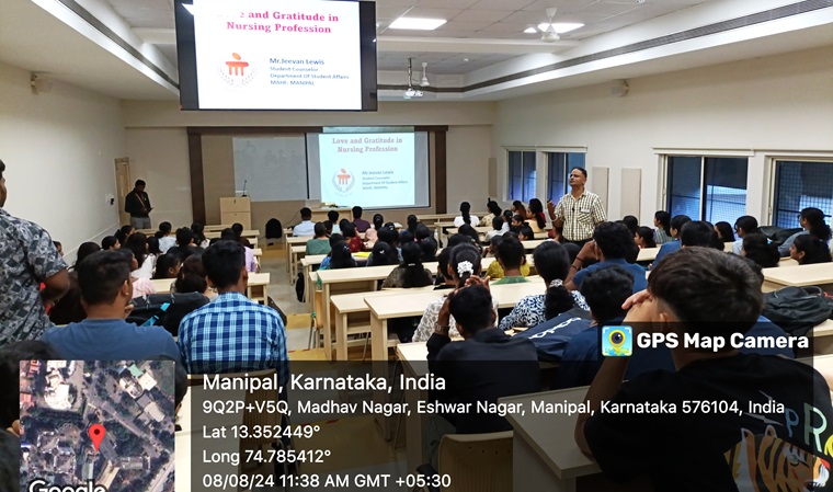 As part of the Deeksharambha orientation program, the Department of Medical-Surgical Nursing at Manipal College of Nursing, MAHE, Manipal, hosted an engaging guest lecture titled "Love and Gratitude" on August 8, 2024. Starting at 11:30 am, the one-hour session was designed for first-semester BSc Nursing students. Mr. Jeevan Lewis, Student Counselor at the Department of Student Affairs, MAHE, Manipal, led the session, emphasising the significance and benefits of love and gratitude in personal and professional realms.