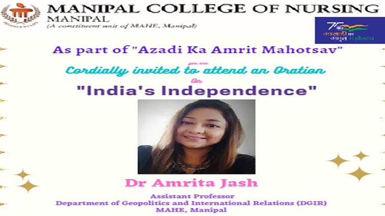 Manipal College of Nursing, MAHE, Manipal has organized an oration on the topic “India’s Independence” on August 13, 2022, between 3.00 pm and 4.00 pm. Dr. Amrita Jash, Assistant Professor, Department of Geopolitics and International Relations (DGIR), MAHE Manipal shared her expertise on India’s Independence.