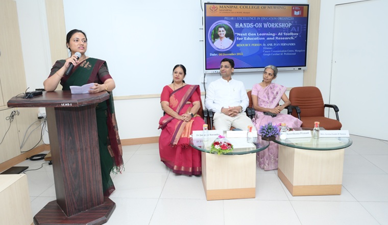 The Manipal College of Nursing (MCON), Manipal Academy of Higher Education (MAHE), under the initiative of Pillar I – Excellence in Education, organized a comprehensive workshop titled “Next Gen Learning – AI Toolbox for Education and Research” on 06 December 2025 at the Medical Education Hall, Second Floor, Library Building, MAHE, Manipal. The program aimed to enhance the understanding of faculty, researchers, and students regarding the effective integration of Artificial Intelligence (AI) tools and their application into teaching, learning, and research.