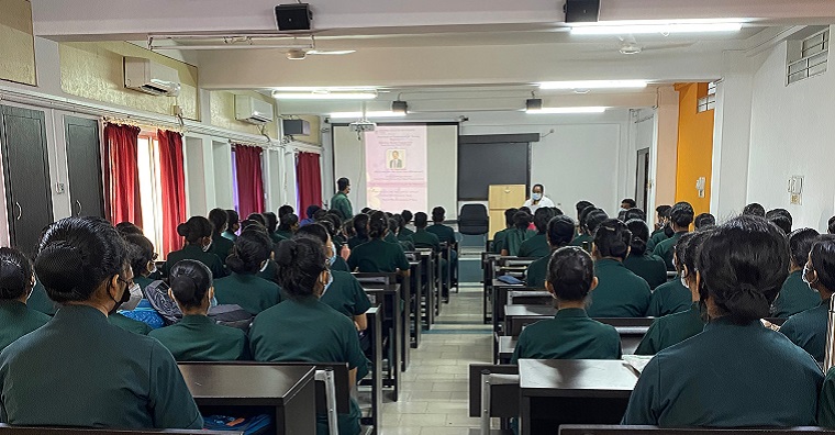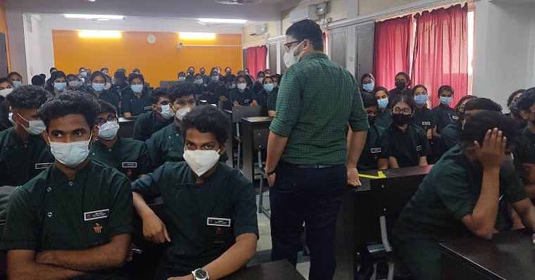 The resource person was Dr Vishnu Renjith, Lecturer and Program Director at School of Nursing & Midwifery, Royal College of Surgeons in Ireland. He shared his experiences when he was a student at MCON. He motivated the first semester BSc nursing students about the choice for taking up nursing as a profession in the right institution and at right time. He also stressed about the nurse's job opportunities worldwide. He met all students and discussed their point of view about nursing and guided them on how they can utilize the resources at MCON and MAHE. A total of 99 (78 female and 21 male students) first semester BSc nursing students and five faculty members were the part of a guest lecture.