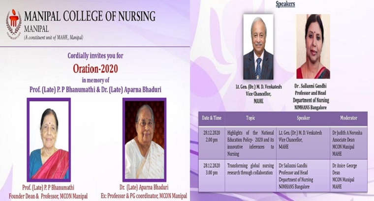 Manipal College of Nursing organized Oration in memory of legends in Nursing late Prof. P. P Bhanumathi, the founder Dean of MOCN and Late Dr. Aparna Bhaduri a world-renowned nurse researcher and the PG Coordinator at MCON MAHE on 28 December 2020.