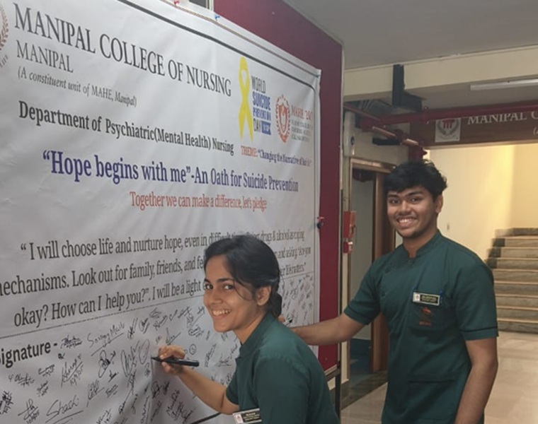 The Department of Psychiatric (Mental Health) Nursing, Manipal College of Nursing (MCON), MAHE, commemorated World Suicide Prevention Day on September 10, 2025, with the theme “Changing the Narrative on Suicide.” The day-long observance included interactive sessions, awareness campaigns, oath-taking pledges, and public outreach, drawing enthusiastic participation from students, faculty, and the wider community. The programme is aligned with the United Nations Sustainable Development Goals (SDGs) 3, 4, 10, 16, and 17.