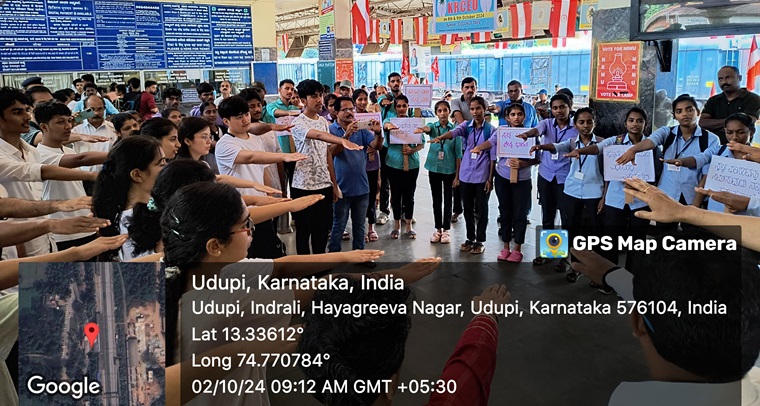 The Department of Community Health Nursing, National Service Scheme (NSS) & Volunteer Services Organization (VSO) Units of Manipal College of Nursing (MCON), in collaboration with the Health Unit of Konkan Railway Corporation Ltd, organised a Swachh Bharath Abhiyan awareness program on 2nd October 2024, as part of the Swachhatha Hi Seva 2024 initiative. The event took place at the railway station in Udupi. The program kicked off with an inaugural ceremony graced by the esteemed presence of Dr. Shenoy, the President of the Indian Medical Association (IMA) Udupi Chapter. The Deputy Chief Medical Officer, Dr. Steven George, led the volunteers to take the Swachh Bharat pledge. A rally featuring impactful slogans on sanitation was conducted, creating awareness among the public. The volunteers distributed pamphlets to residences and shops during their house visits, sensitizing the community on the significance of maintaining a clean environment. The initiative was well received by all participants and garnered appreciation for its efforts towards promoting cleanliness and hygiene in the community. This collaborative programme is aligned with Sustainable Development Goal 3 (Good Health and Well-being), 6 (clean water and sanitation), and 17 (partnership for the goals), as it serves to raise awareness about health and hygiene practices among the public, contributing to a healthier and cleaner environment for all.