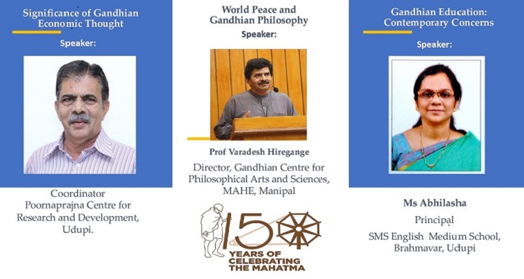 The virtual symposium was a series of discourse by three eminent resource persons. Dr Krishna Kothai, Coordinator of Poornaprajna Centre for Research and Development, Udupi spoke on the significance of Gandhian economic thought. Ms Abhilasha, Principal of SMS English Medium School, Brahmavar, Udupi talked about Gandhian education: contemporary concerns and Professor Varadesh Hiregange, Director of Gandhian Centre for Philosophical Arts and Sciences, MAHE, delivered a talk on World Peace and Gandhian Philosophy.