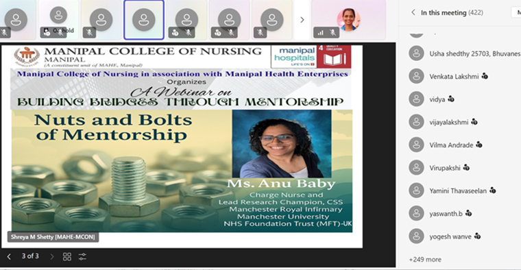 Manipal College of Nursing, MAHE, Manipal, in association with Manipal Health Enterprises Private Limited, Bengaluru, successfully organized a webinar titled “Building Bridges through Mentorship” on 13 April 2026 from 2:00 PM to 4:00 PM via Microsoft Teams.