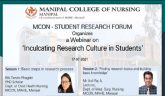 The Student Research Forum of Manipal College of Nursing (MCON), MAHE, Manipal organized a webinar on “Inculcating Research Culture in Students”. The first two sessions of the year-long webinar series were held on 17 July 2021 from 3.00 pm to 5.00 pm. The target audience were the undergraduate & postgraduate students, PhD Scholars, and Project Staff of MCON, MAHE, Manipal. Dr Binil V, Associate Professor, Department of Psychiatric (Mental Health) Nursing, MCON, and Faculty Advisor of SRF-MCON addressed the participants and briefed the objectives of SRF-MCON. He also spoke on the importance of the webinar series. Ms. Tenzin Phagdol, PhD. Scholar, Department of Child Health Nursing, MCON, Manipal discussed the basic steps in a research process and Mr Anil Raj A, Lecturer, Department of Medical-Surgical Nursing, MCON, Manipal took a session on finding research topics and building basic knowledge. Both the sessions were interesting and were highly appreciated by the participants. A total of 90 participants attended the webinar sessions. E-certificate was given to the participants.