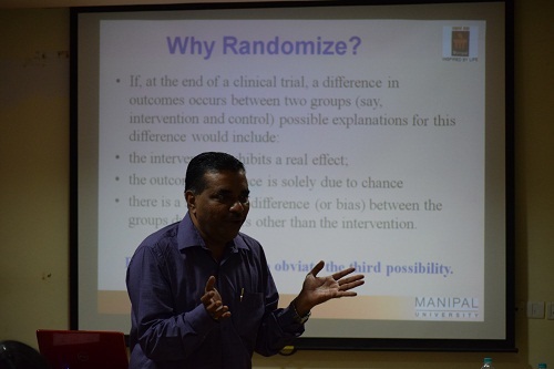 The last session in the morning was on ‘Classification of RCTs’ which was covered by Mr. Nageshwar and Ms.Renu, PhD scholars of MCON Manipal. The afternoon session started with ‘Bias in RCTs’ by Mr. Aldrin Vas, PhD Scholar and the session was moderated by Dr. Judith A Noronha, Associate Dean, MCON Manipal. Dr. Judith reinforced on the need of avoiding selection bias and how to report the findings. The next session was on ‘Analysis of RCTs’ by Dr. Binu V S, Associate Professor, Department of statistics, Manipal Academy of Higher Education. He explained analysis of RCTs with problem solving exercises.