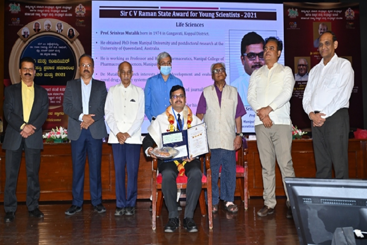 Dr. Srinivas Mutalik, Professor and Head, Department of Pharmaceutics, Manipal College of Pharmaceutical Sciences, MAHE, Manipal has been awarded the prestigious Sir CV Raman Young Scientist State Award in the field of Life Sciences, instituted by the Government of Karnataka. He received the award on 23rd March 2023 at J N Tata Auditorium, Indian Institute of Science, Bengaluru from Dr. CN Ashwath Narayan, Hon’ble Minister for Higher Education, Electronics, IT, BT, and S&T, Government of Karnataka in the presence of Bharat Ratna Prof CNR Rao. Other dignitaries present at the function were Sri A S Kiran Kumar (Former Chairman of ISRO), Prof. Govindan Rangarajan (Director, IISc), and Dr. E V Ramana Reddy (Additional Chief Secretary).
