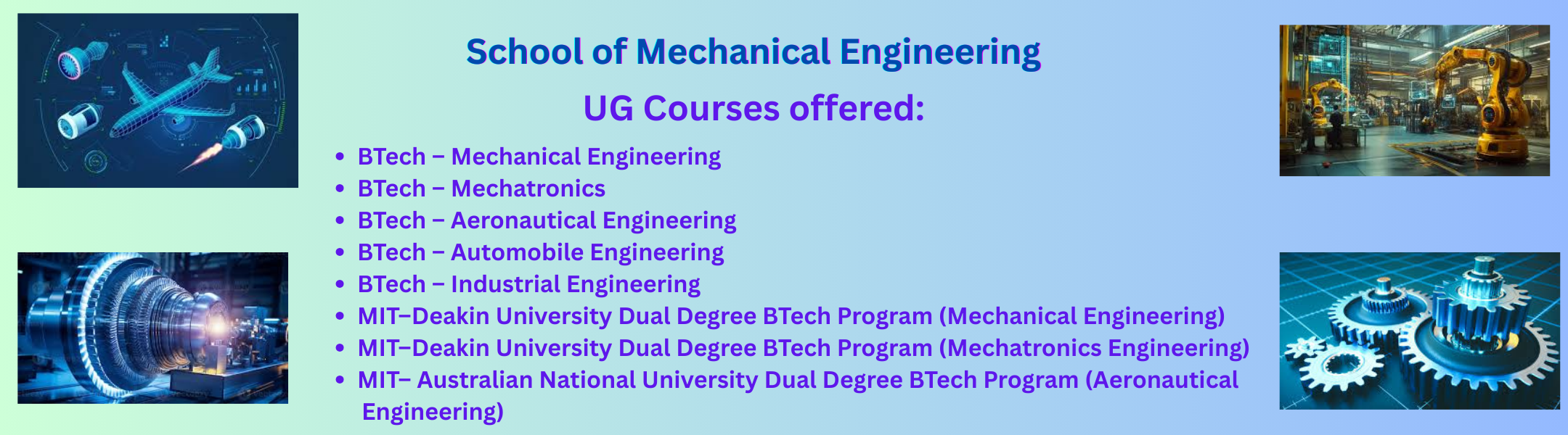 The School of Mechanical Engineering established on 1 January 2026, integrates three well‑established academic domains at MIT Manipal Mechanical & Industrial Engineering, Mechatronics, and Aeronautical & Automobile Engineering into a unified ecosystem known for its strong accreditation record, advanced laboratory infrastructure, industry partnerships, and a sustained commitment to interdisciplinary education and research excellence.