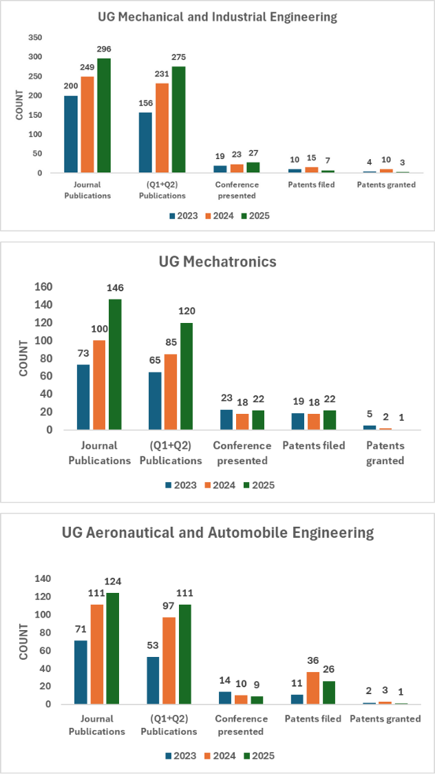 The School of Mechanical Engineering, established on 1 January 2026, unifies three long-standing academic and research streams at MIT Manipal: Mechanical & Industrial Engineering (1960), Mechatronics (2006), and Aeronautical & Automobile Engineering (2008). Together, they form a cohesive ecosystem distinguished by strong national and international accreditations, advanced laboratories, and extensive industry linkages. The Mechanical & Industrial Engineering stream enriches the School with a broad portfolio of minor specializations spanning design, thermal sciences, materials, manufacturing, automation, robotics, quality engineering, IIoT, coding, and Electric Vehicle Technology, the latter offered in collaboration with L&T EduTech. Complementing this, the Mechatronics stream hosts key Centres of Excellence including the Bosch Rexroth Hydraulics & Pneumatics facility, collaborative engagements with C‑DAC, and the Altair–MIT AI Research initiative. These capabilities are further strengthened through active MoUs with Orangewood Labs, Codemischief, JMAG International, and Bosch Rexroth, supporting research, training, and technology-driven collaborations. The Mechanical & Industrial Engineering and Mechatronics Engineering streams contributes interdisciplinary depth through globally aligned programs such B.Tech Dual Degree in Mechanical Engineering (2024), an international dual degree program in collaboration with Deakin University, Australia. Expanding the School’s technological breadth, the Aeronautical & Automobile Engineering stream offers a well‑structured program supported by sophisticated facilities such as a Composite Manufacturing and Testing Lab, Avionics Lab, Aerodynamics and Propulsion Lab, Structures Lab, Human–Machine Interaction Lab, and Acoustics Lab. Its research strengths span aerodynamics, CFD, AI/ML, space technology, biomimetics, composite materials, and avionics. The stream also houses the Centre for Aerospace Science and Technology (CAST) and a Centre of Excellence for Avionics, promoting advanced research and industry collaboration. A notable partnership with IN‑SPACe enables a minor specialization in Space Technology, while active student-led initiatives such as AeroMIT, DronAid, ThrustMIT, and Parikshit foster experiential learning, interdisciplinary teamwork, and real‑world problem solving. Over the years, these units have collectively developed into a centre of excellence known for rigorous technical education, innovative pedagogical practices, and a vibrant culture of research and industrial engagement. Enhancing this foundation, the School hosts specialized centres created in collaboration with prominent industry partners, including facilities supported by Forbes Marshall Private Limited and NICO – Nanobubble India Co., which enable applied research and industry-focused problem solving. It also houses the Intel Unnati AI/ML Laboratory, providing learners with state‑of‑the‑art exposure to artificial intelligence, machine learning, and data-centric technologies. ![]()