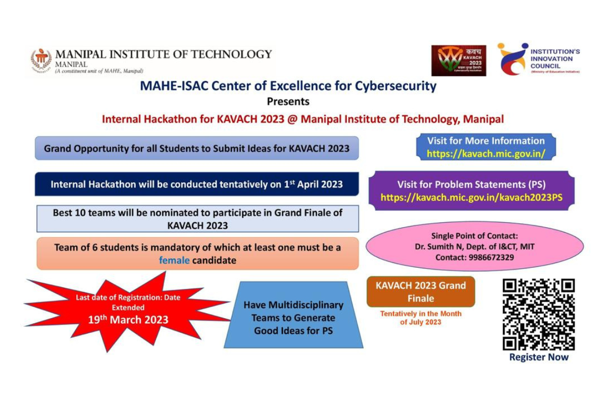 And if you make the cut as one of the top 10 teams in Manipal's Internal Hackathon, get ready to take on the national stage at KAVACH 2023! Don't wait, let your team leader register now: "