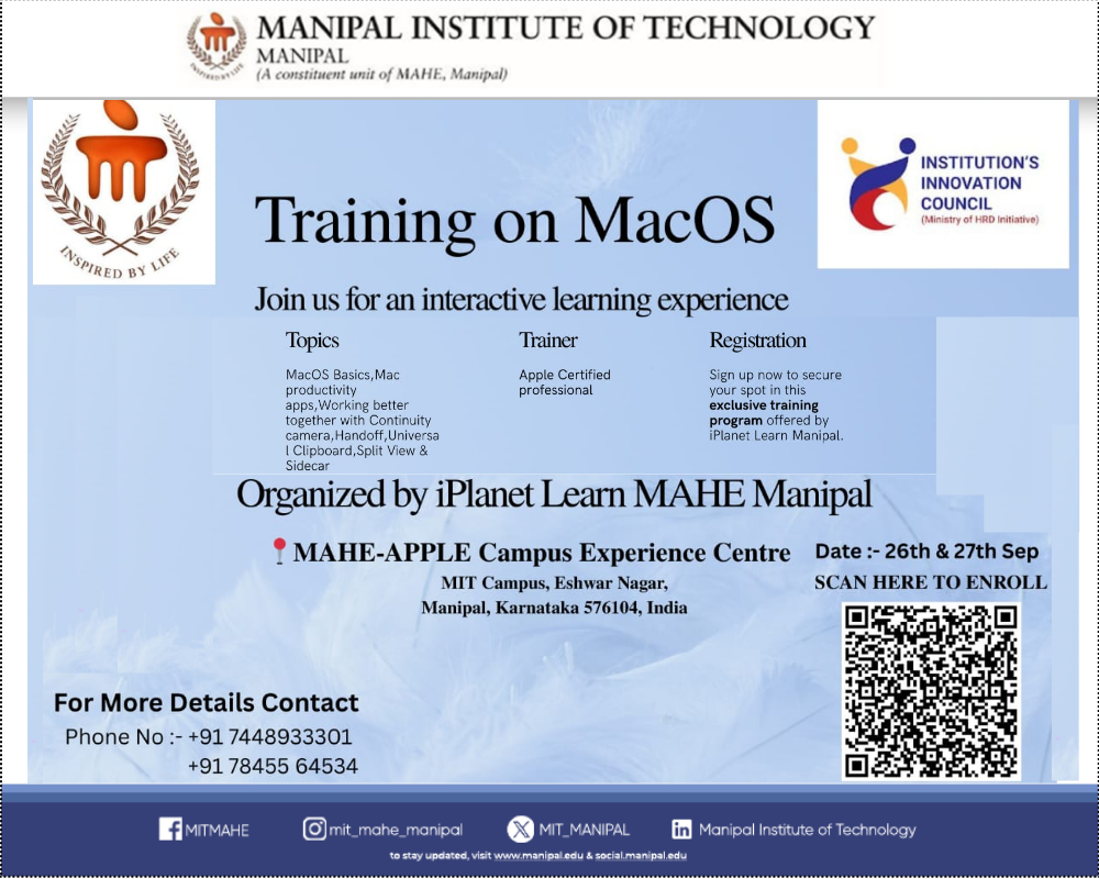 The training will be held on 26th and 27th September at the MAHE–APPLE Campus Experience Centre, MIT Campus, near Student Plaza. Organized by iPlanet Learn, MAHE Manipal, and conducted by an Apple Certified Professional, the sessions will cover MacOS Basics, Productivity Apps, Continuity Camera, Handoff, Universal Clipboard, Split View, and Sidecar.