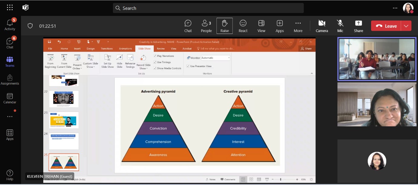 On the 20th of September, 2023, Dr Kulveen Trehan conducted a webinar on the topic of ‘Creative Executions in Advertising in the Digital Era’ for the MA Multimedia and Communication students of MAHE’s Bengaluru campus.