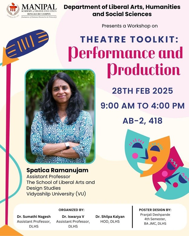 On the 28th of February 2025, the Department of Liberal Arts, Humanities and Social Sciences (DLHS), MAHE-Blr organized an enriching day-long Theatre Workshop titled “Theatre Toolkit: Performance and Production” for II Year JMC students and II Year Postgraduate students of English Language and Literature.