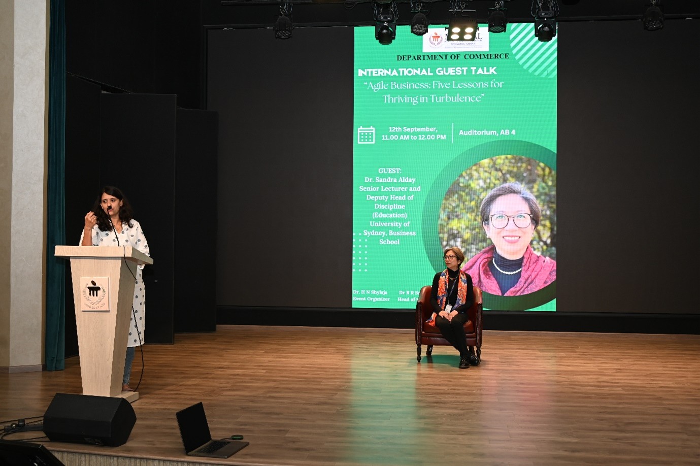 The Department of Commerce organised an insightful international guest talk titled “Agile Business: Five Lessons for Thriving in Turbulence”. The event aimed to equip first year BCOM students with practical insights and strategies to navigate the complexities of a rapidly changing business environment. The guest speaker for the event was Dr Sandra Seno-Alday, Senior Lecturer, Business School, University of Sydney, Australia. With a strong academic background, she has contributed to various research projects and published numerous articles in reputable journals.