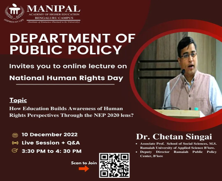 On the occasion of National Human Rights Day, 10th December 2022, DPP conducted an online lecture with Dr. Chetan Singai, speaking on “How Education builds awareness of human rights perspectives through the NEP lens”. Event to think about what we can do better as educationists! #highereducation #highereducationresearch #humanrights #humanrightsday