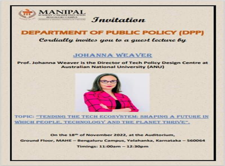 Department of Public Policy, MAHE, Bengaluru hosted a guest lecture by Professor Johanna Weaver, Director of Tech Policy Design Center, Australian National University on 18th November at 11 AM. Introduction by Dr. Harini and address by Prof. Weaver #TechEcosystem #PublicPolicy