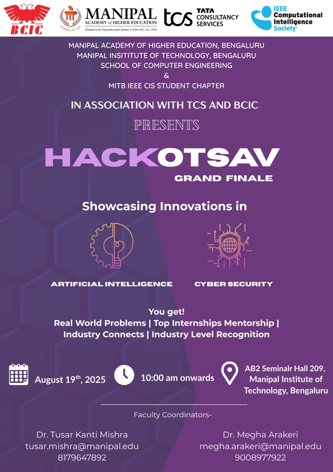 The School of Computer Engineering and IEEE CIS Student Chapter, MIT Bengaluru, in collaboration with TCS and BCIC, is proud to host HACKOTSAV 2025 – Grand Finale on August 19, 2025, at MAHE Bengaluru.