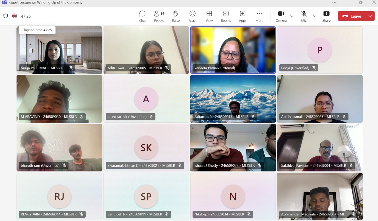 Manipal Law School, Bengaluru, organised an online Guest Lecture on "Winding Up of a Company". The session was conducted by Dr. Vaneeta Patnaik, Associate Professor at NUJS, Kolkata, and a distinguished academic in the field of corporate law.